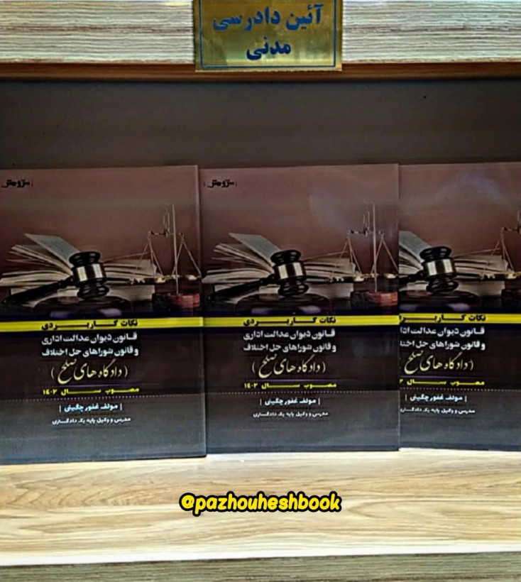 نکات کاربردی قانون دیوان عدالت اداری و قانون شوراهای حل اختلاف ویژگی های مهم کتاب ۱. دسته بندی مواد قانونی پراکنده و چیدمان و تبیین مواد بر اساس تشابه موضوعی . ۲. جلوگیری از قلم فرسایی و پرداخت به مطالب اصلی بصورت کامل اما مختصر ۳. حذف مواد قانونی غیر کاربردی جهت جلوگیری از افزایش حجم بیهوده کتاب ۴. درج متن هر دو قانون که خواننده را از تهیه کتاب قانون بی نیاز نماید . طبیق و مقایسه برخی مطالب با عمومات قانون آیین دادرسی مدنی ۶. تحلیل و ذکر مثال در برخی مطالب جهت درک بهتر خواننده. کتابسرای حقوقی پژوهش ثبت ۰۹۹۱۸۹۹۰۵۰۷ @pazhouheshbook